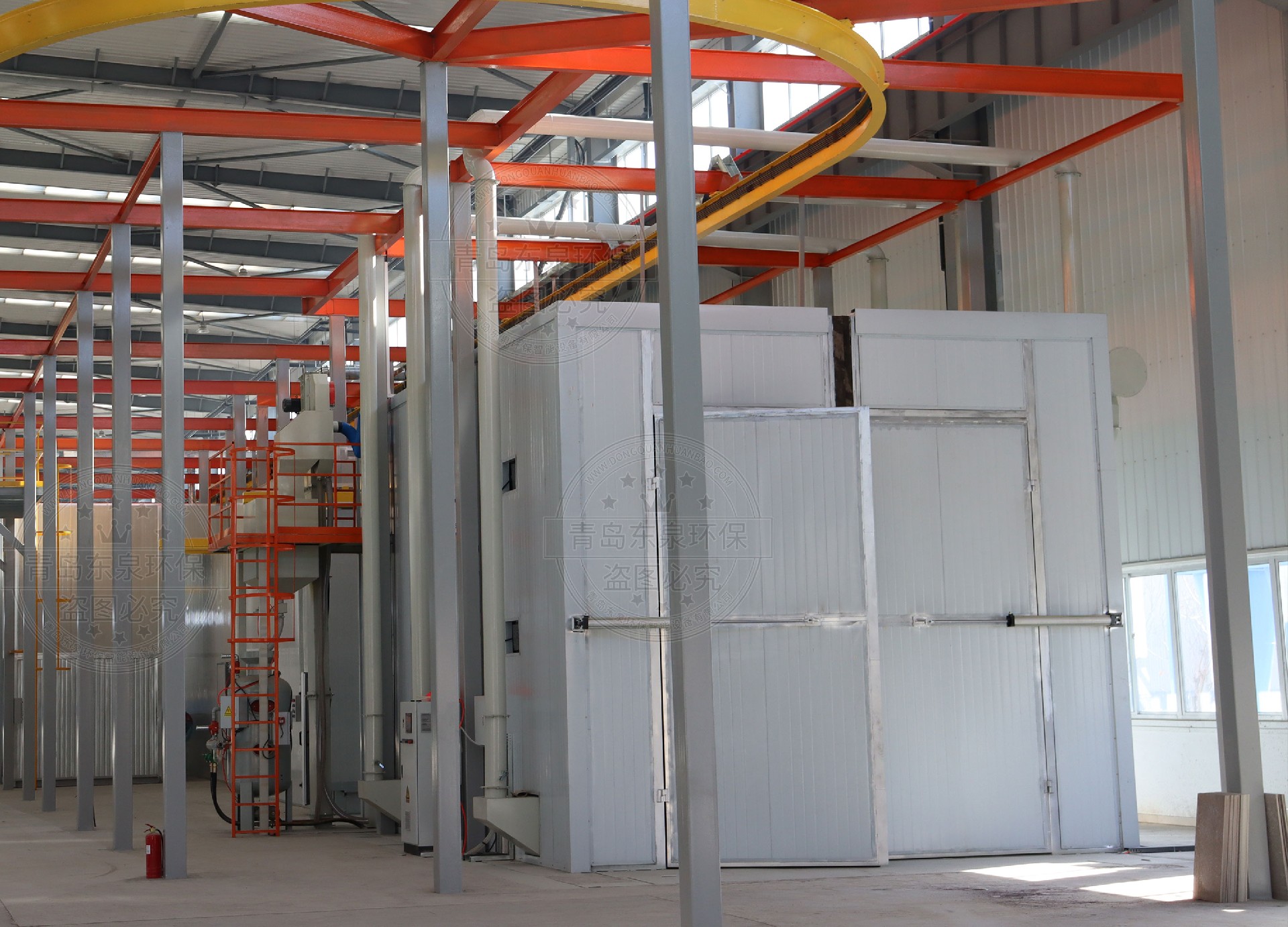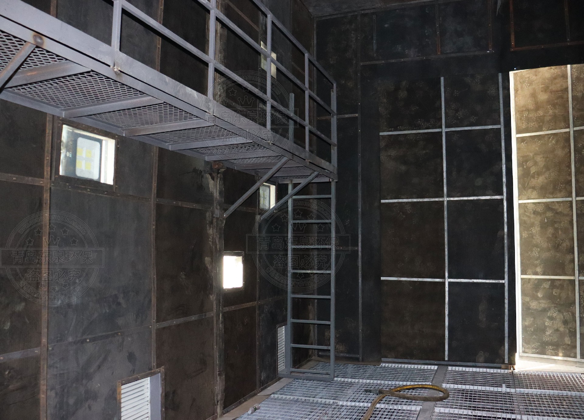 5)采用型鋼做室體框架,外面覆蓋50mm厚彩鋼夾芯板。室體內部滿鋪1.5mm鋼板,減少鋼丸沖擊及損壞;內襯3mm耐磨橡膠板,防止丸料對板壁的沖擊磨損,噴砂室兩端開門。在噴砂室體兩側各配置1個工作安全門,便于操作人員調整噴砂主機和對設備進行檢修及出現故障時安全撤離。在噴砂室側壁和大門上配置透明觀察窗。